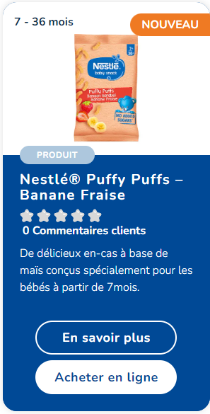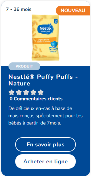 Les Nestlé Puffy Puffs sont spécialement conçus pour répondre aux petites faims des bébés à partir de 7 mois. Leur recette sans colorants, sans conservateurs ni arômes artificiels* et leur forme font d'eux la collation parfaite pour permettre à votre enfant de découvrir de nouvelles saveurs et textures à son propre rythme. Leur petit format vous permet de l'emporter partout avec vous.